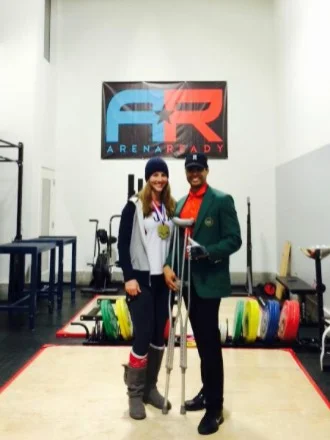 Tiger holds her crutches because Tiger is a gentleman, obviously.