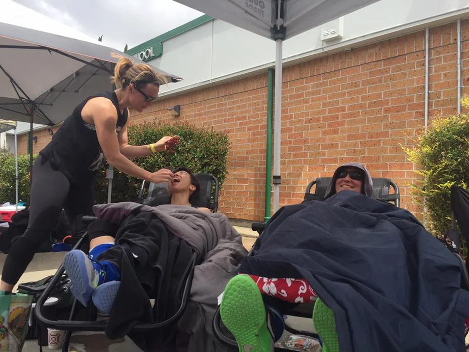 Here's Coach Linds helping the elder stateswomen (masters athletes) Kim and Coach Hillary - better known as "Team Old Fashioneds" - recover in between events: