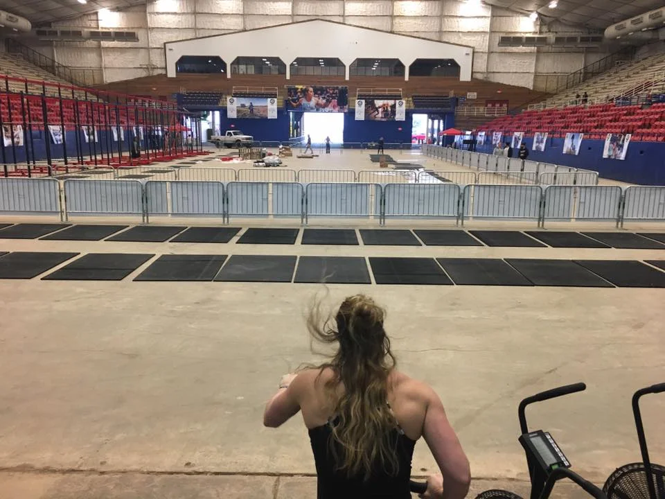 Sarah shaking out the travel while testing the D-Ball + Assault Bike WOD for this weekend's competition. The venue looks great!