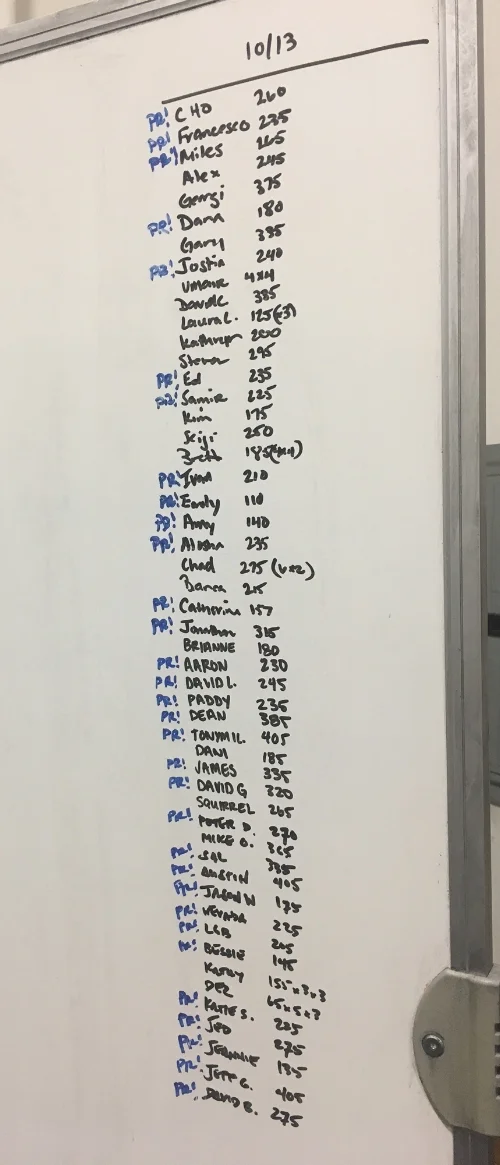 Congratulations to the dozens of athletes who set new 1-Rep Max PRs on their back squat this past weekend. Starting with Friday classes we had over 40 new PRs and saw an overwhelming majority of members hitting new, BIG numbers -- several others added their PRs at Open Gym on Sunday morning, and remotely during their travels.