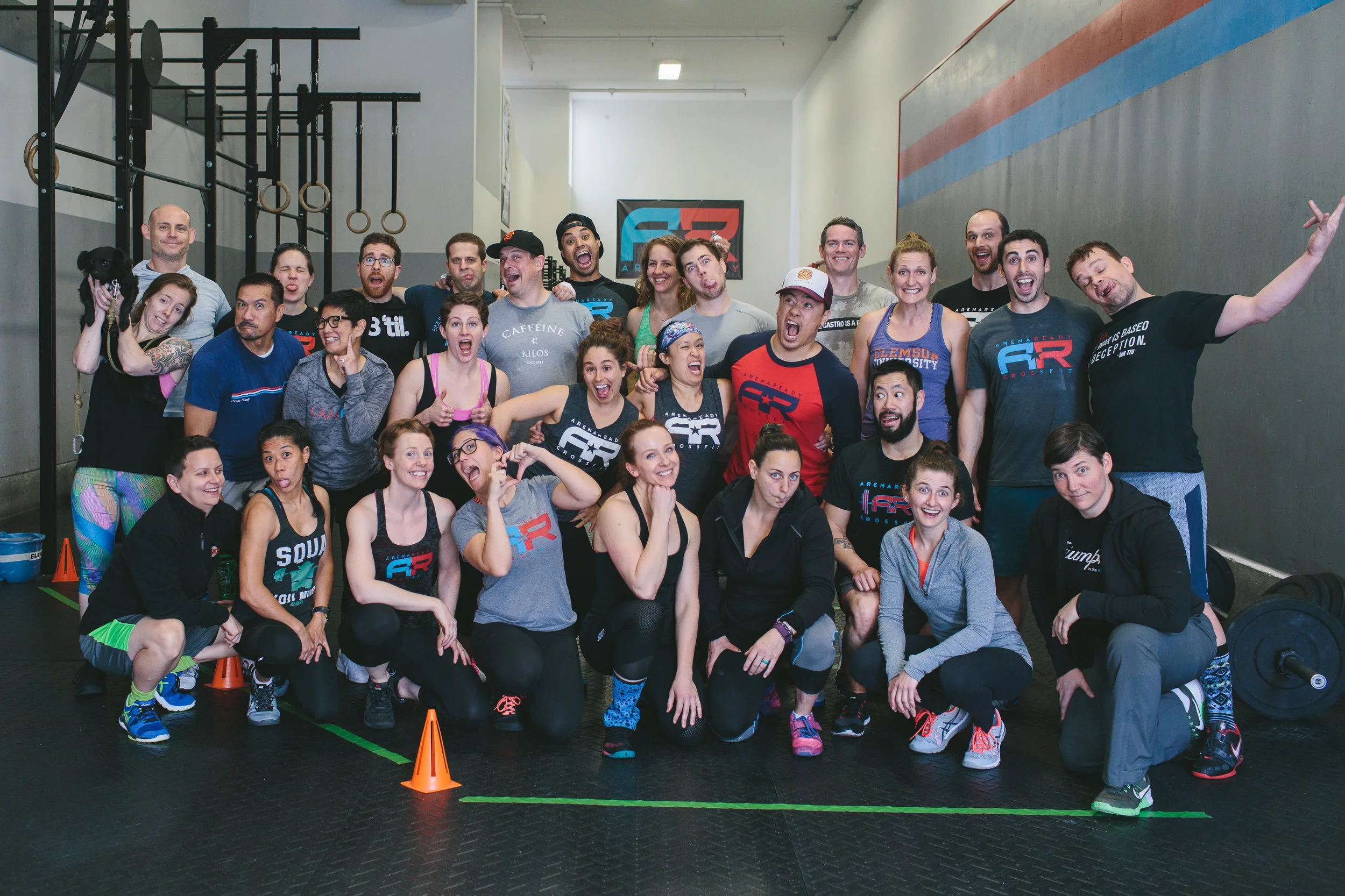 All three athletes run the 1000m buy-in TOGETHER, then SPLIT the remaining movements thereafter with only one person working at a time. The first athlete finished on the run may start the row immediately, and does not have to wait for the other two athletes - however, burpees, power cleans, and push jerks cannot start until the preceding movement is completed. Split reps may be shared in any fashion (does NOT have to be equal).