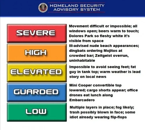 It's that time of year again in San Francisco - the stretch of a handful of weeks during which I try my best not to look down too much in public, for fear of seeing some gnarly man feet resembling hairy talons clinched to a pair of Rainbows. Thank goodness the forecast looks to be showing some cooling trends starting on Thursday/Friday, since Tuesday's reading on the SF Weather Advisory System is: HIGH.