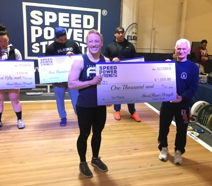 Next up was Cassie, and as many of you saw on the live feed, and in person at the meet, she basically LIFTED ALL OF THE WEIGHTS by going a perfect six-for-six. Cassie snatched 77kg and clean & jerked 93kg for a HUGE 170kg total in the 59kg bodyweight category. This easily qualified her for the 2019 USAW Senior National Championships, making her the 8th Arena Ready athlete to qualify for a national-level and/or international-level meet. Cassie’s big day was also good enough to win the meet overall (across every lifter and all bodyweight classes) on Sinclair total — a victory which came with a $1,000 prize check awarded to her by 1972 OLYMPIC CHAMPION, two-time Olympian, and former USA Weightlifting National Team Coach, Zygmunt Smalcerz: